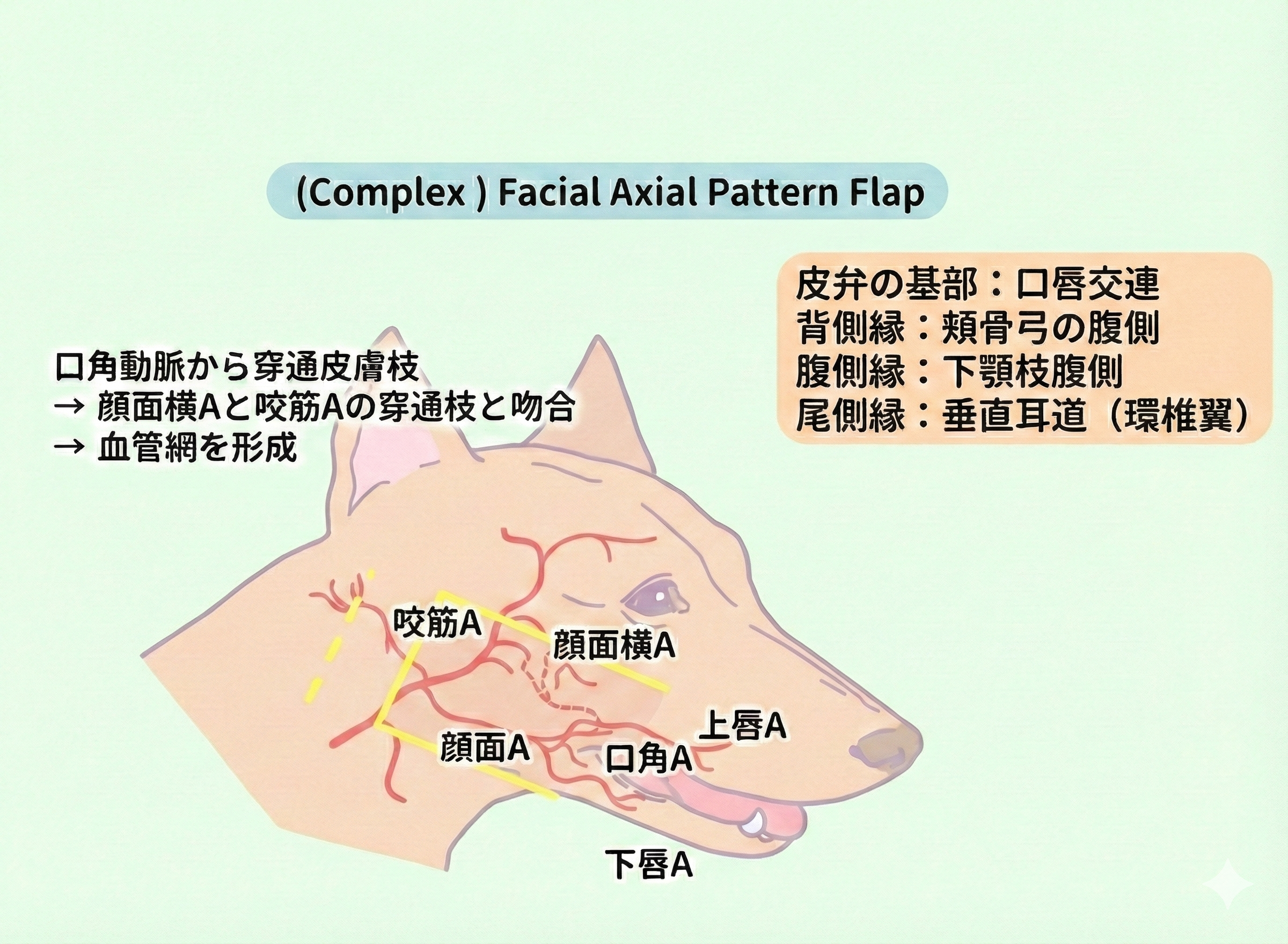 口角動脈(Angularis Oris Artery)および顔面横動脈・咬筋動脈の穿通枝ネットワークを血管茎(Pedicle)とする、極めて血流が豊富で頑強なAxial Pattern Flap(軸性血管皮弁)です。
