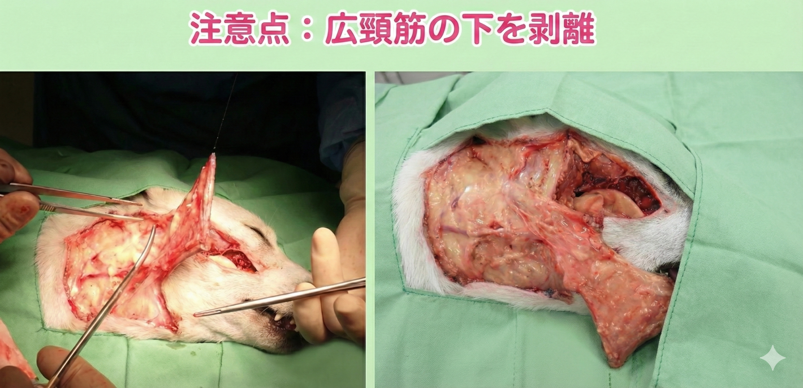 手术剥离时,务必保持在颈阔肌 (Platysma) 下方进行,以确保皮瓣血供,同时需小心避免损伤深层的面神经分支和腮腺管。