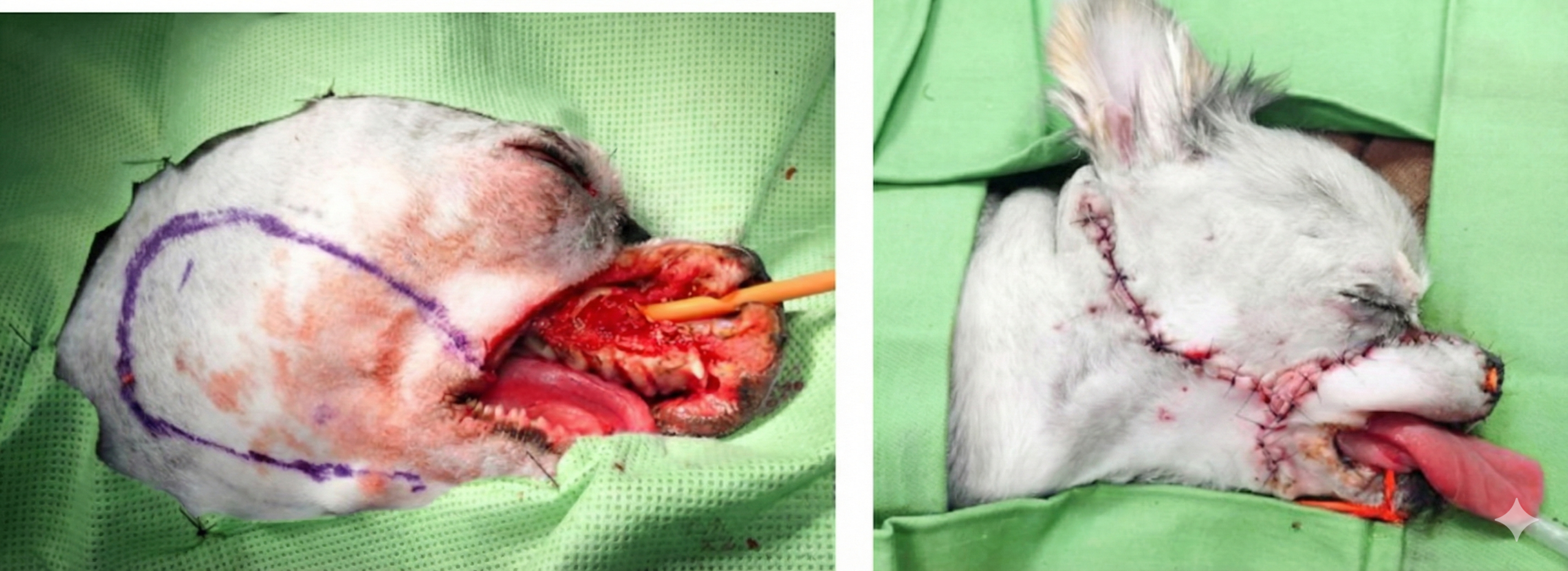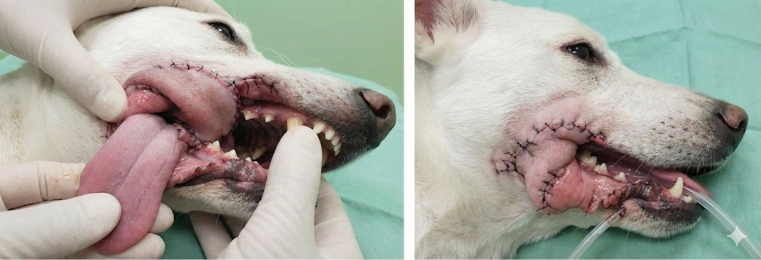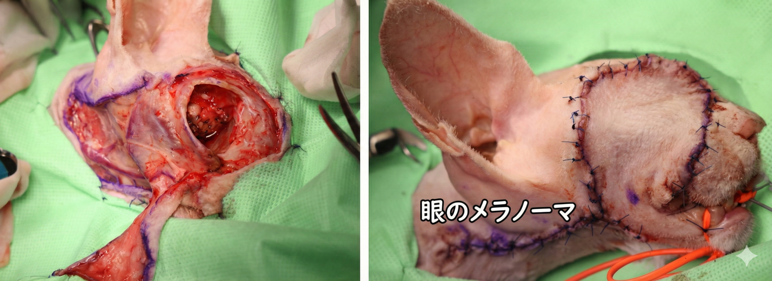 顔面や口の中の大きな腫瘍を切除した後、どうしても皮膚や粘膜が足りなくなってしまうことがあります。無理に縫い合わせるとひきつれたり、傷が開いてしまうリスクがあります。(口腔内/眼球メラノーマ、扁平上皮癌、肥満細胞腫)
