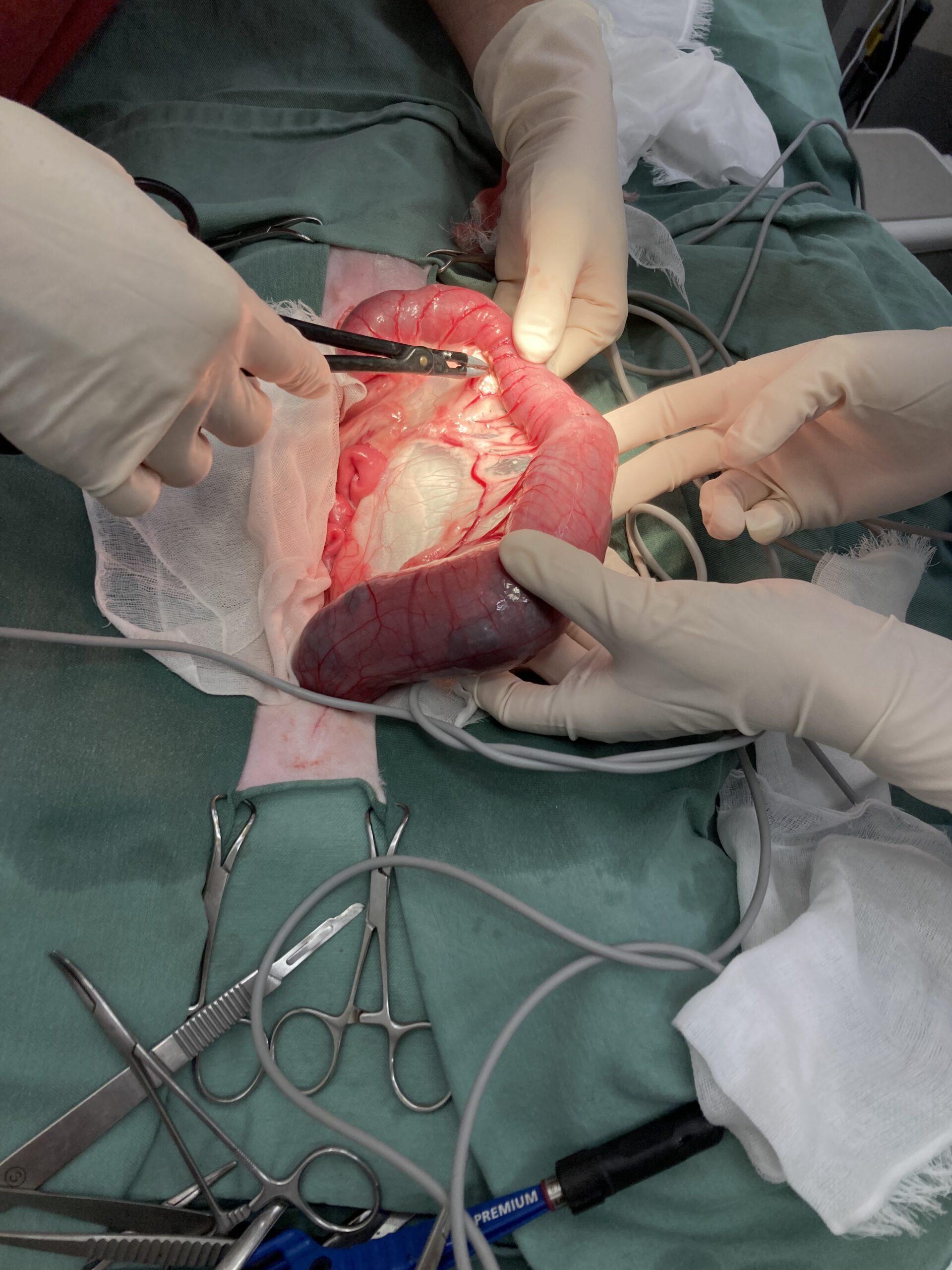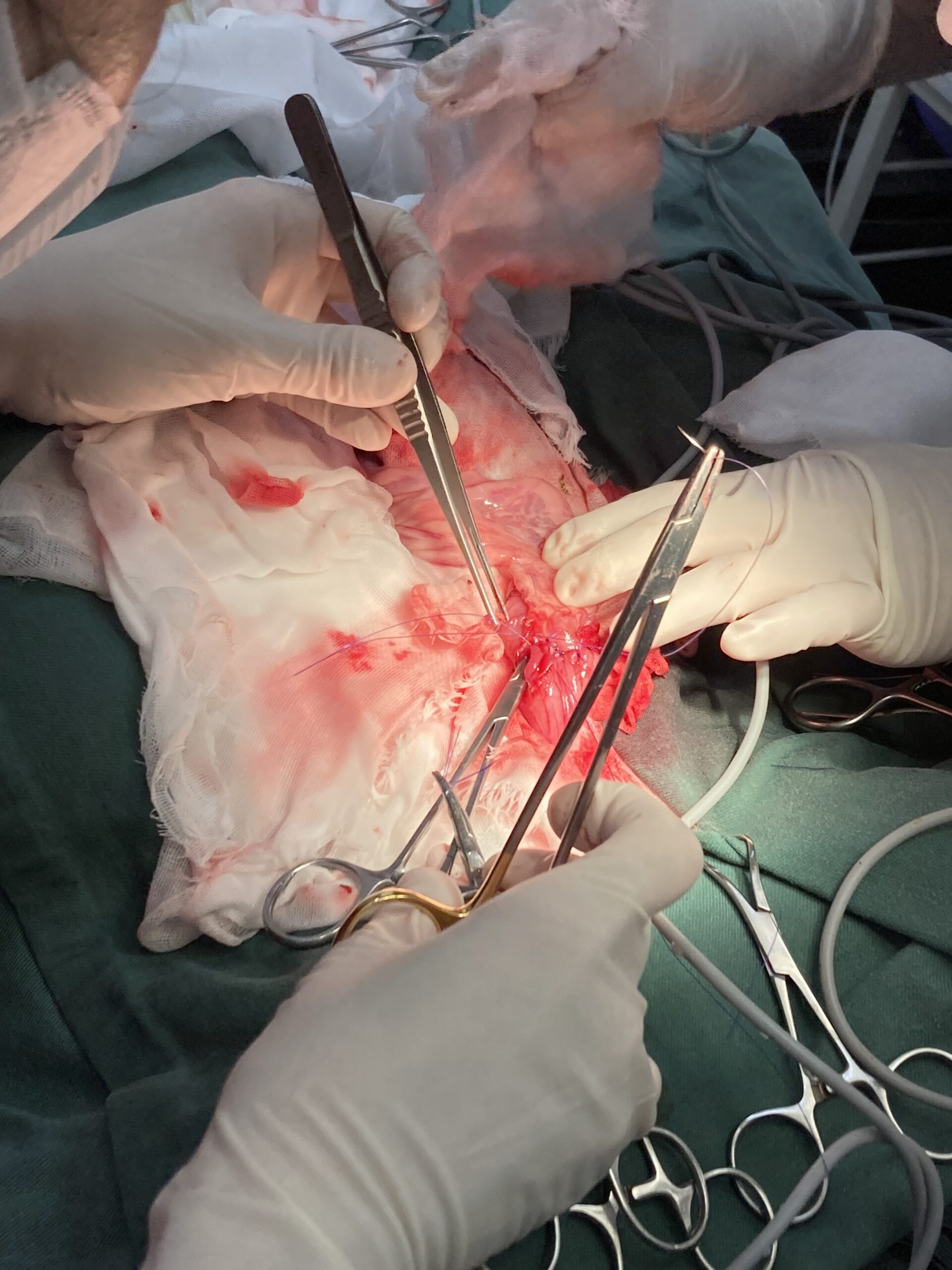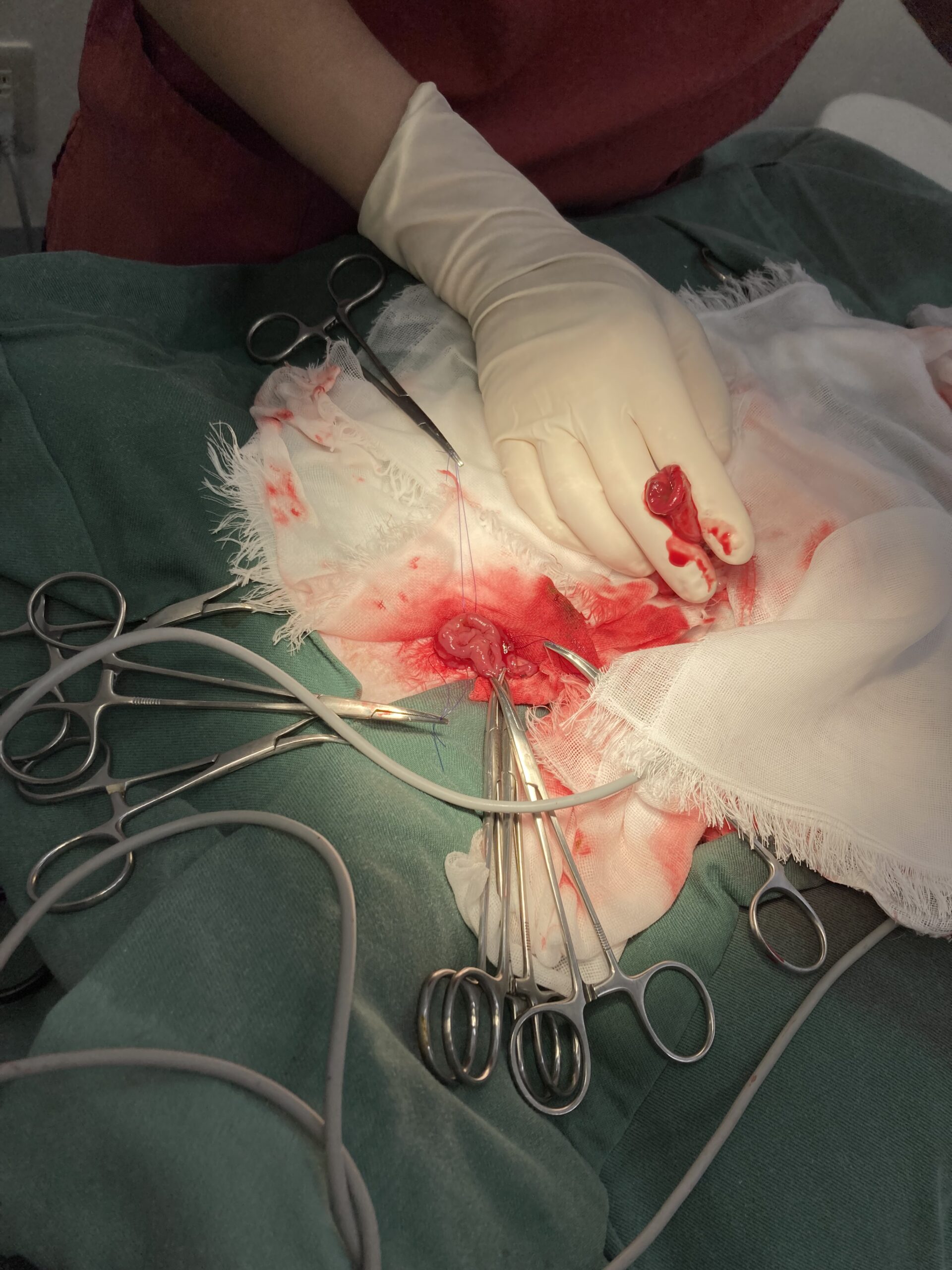 - ペンロスドレーンの設置とその意義: 術創部には柔らかい管(ペンロスドレーン)を留置しました。腸管を切除・吻合する手術では、術後に滲出液や微小な漏れが生じるリスクが拭えません。これらを腹腔内に溜め込まず、体外へ安全かつ速やかに排出することで、致死的な腹膜炎を未然に防ぐ重要な「命綱」となります。外部から細菌が逆行して侵入するリスクもゼロではないため、エコー等で腹水がないことを確認でき次第、速やかに抜去します(本症例も術後早期に安全に抜去しています)。