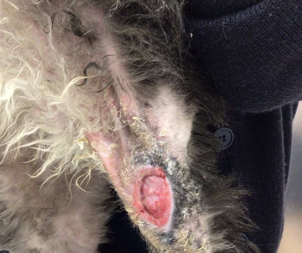 本症例の術後経過において、皮膚の一部に壊死と感染症の発生が認められました。外部機関での細菌培養検査の結果、「ESBL産生大腸菌」という強毒性の薬剤耐性菌が検出されました。一般的な抗生剤が効かず、有効な内服薬は大きな副作用を伴う厳しい状況でした。
