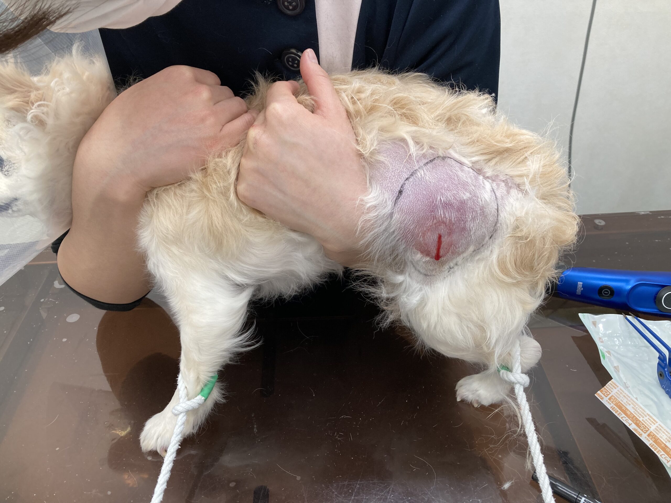 第1病日の初診時、左腰背部に直径4cmの可動性のある腫瘍が認められました。細胞診で肥満細胞腫と診断され、早期の外科的介入が必要と判断し、第8病日に初回の手術を実施しました。