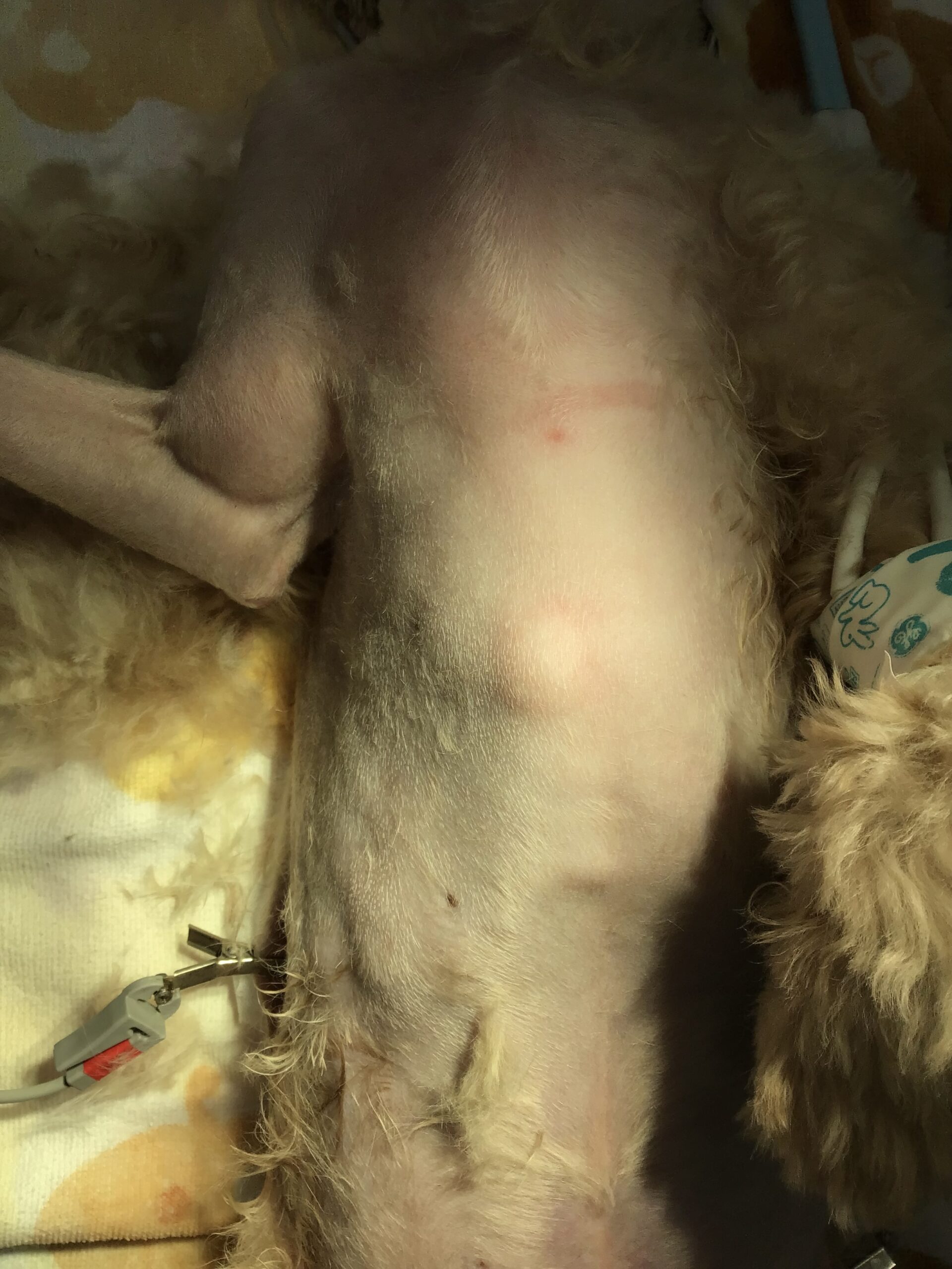 腋窩の腫瘤を放置して巨大化した場合、前肢の可動域が物理的に制限され、歩行困難に陥ります。皮膚が引き伸ばされて自壊すれば、重度な感染や慢性的な激痛を引き起こします。