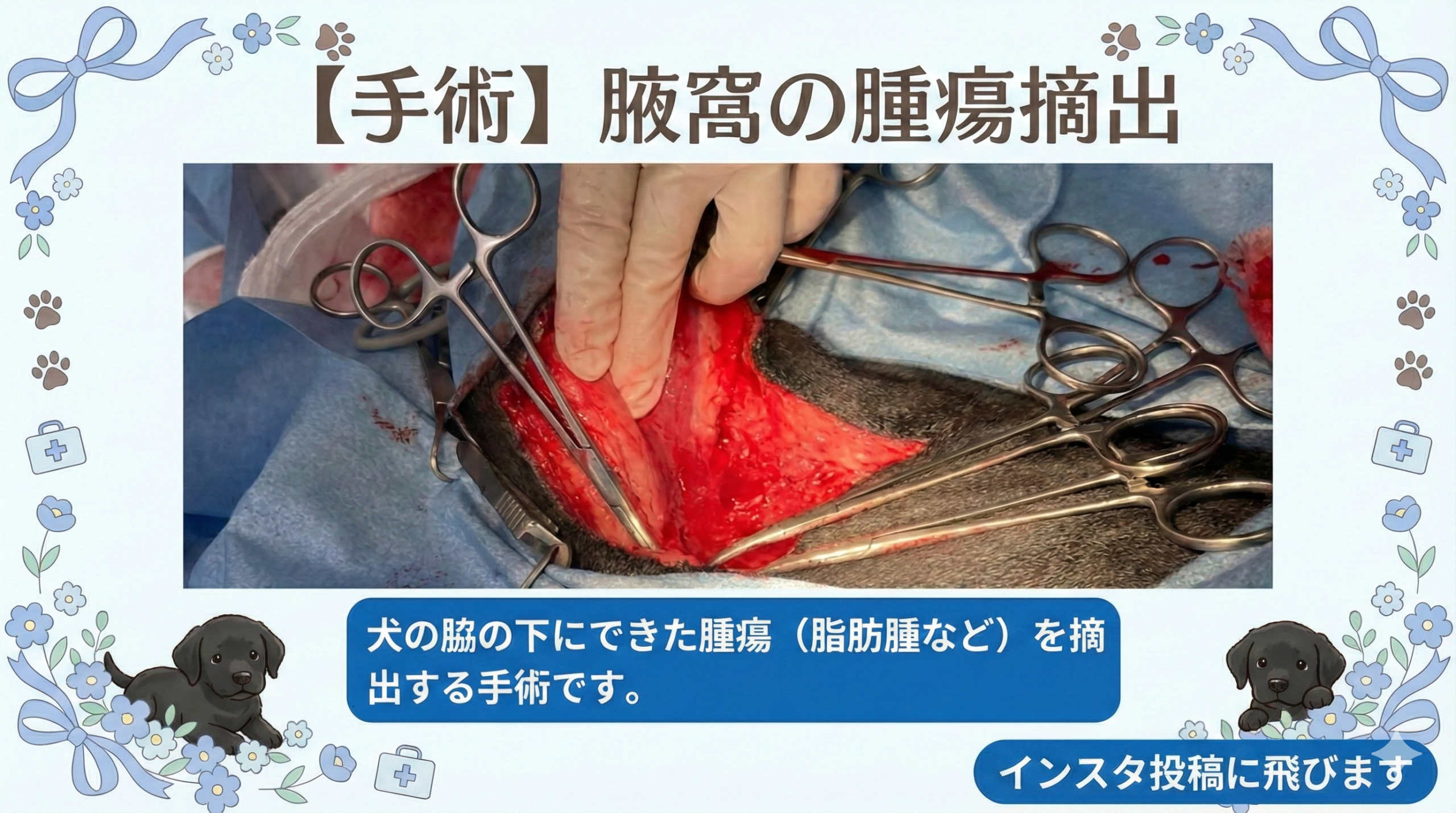This case involves the surgical removal of a lump from the right armpit (axilla) of a Labrador Retriever. Since the location caused friction during walking, surgical removal was performed. The pathology report confirmed it was a benign “lipoma”. If you find any lumps or bumps on your dog, please consult your veterinarian immediately.