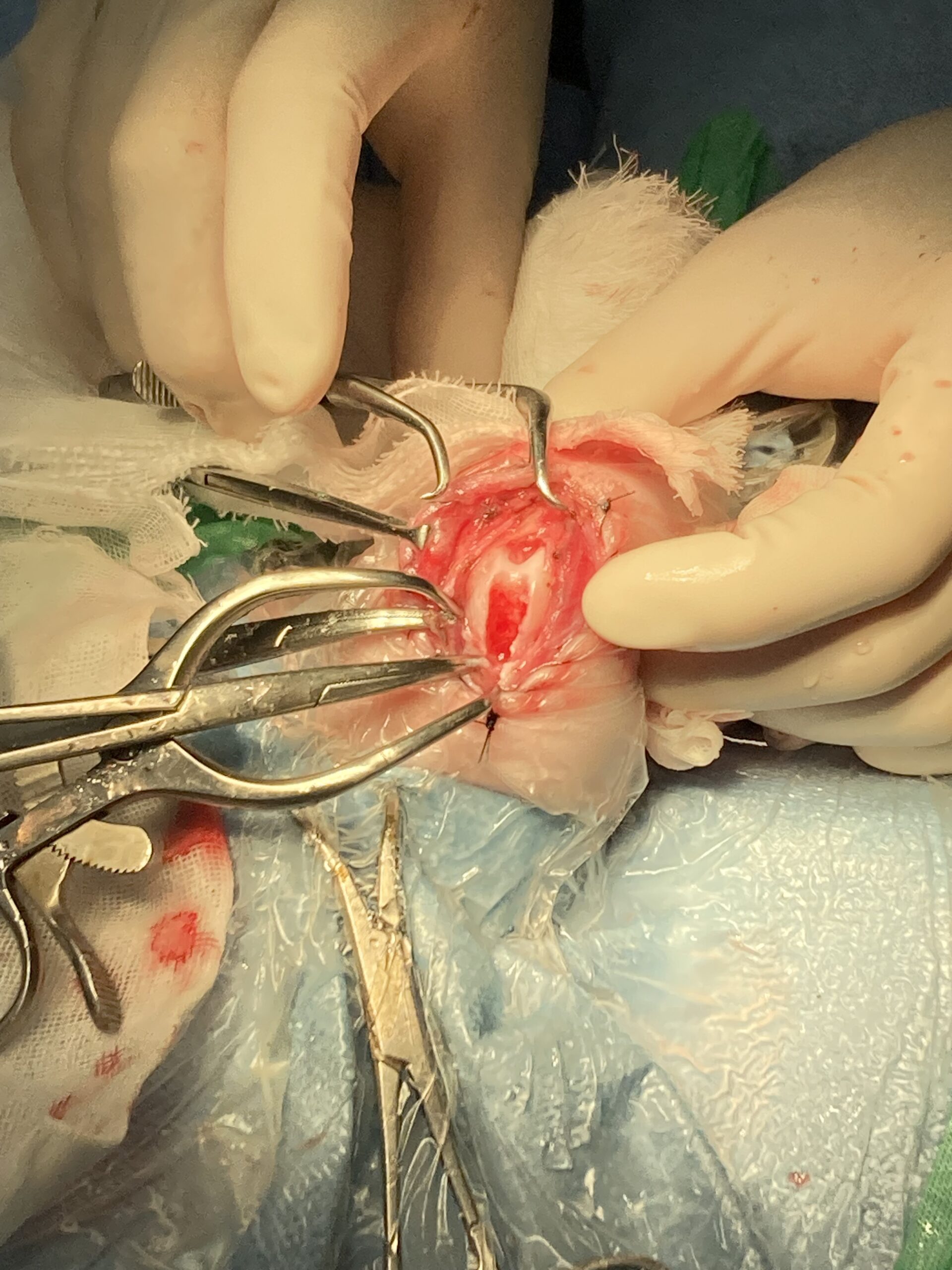 - 術後の経過:術後の診察では体温や体重も安定しており、膝の経過も良好(パテラOK)と確認されました。術後数日経った頃には、寝起きや朝に30秒ほど少し足をかばう様子(びっこ)が見られましたが、傷口に膿などはなく綺麗な状態でした。抗生物質(トミロン)や痛み止め(プレビコックス)を服用し、ご自宅での消毒(スクラブ)を行いながらお家での安静とケアを頑張ってくれています。