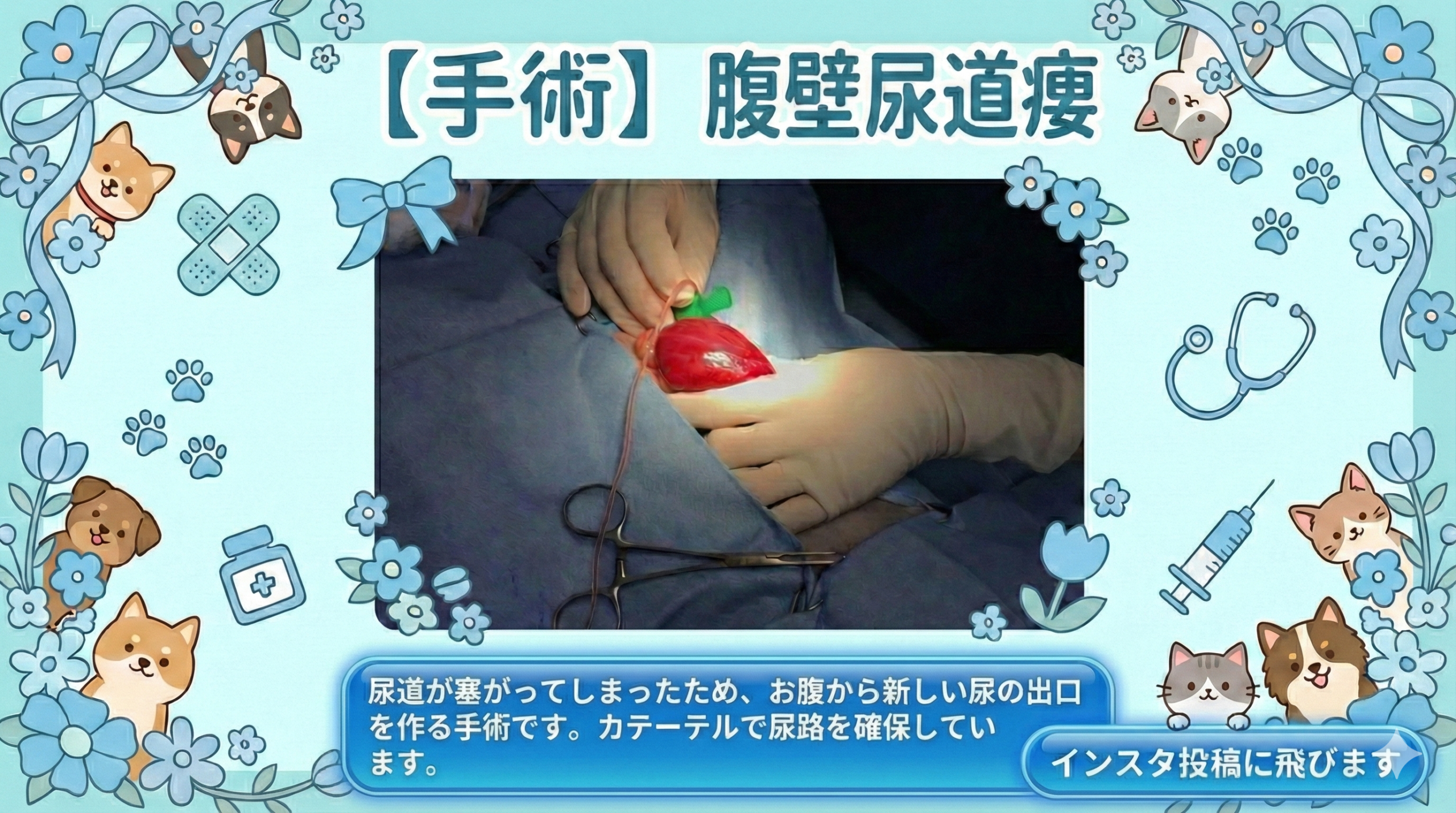 通常、尿道が詰まった場合はカテーテルを通したり、お尻のあたり(会陰部)で尿道を広げる処置を行います。しかし、今回は陰茎の壊死が進んでおり、通常のルートでおしっこを出せるようにすることが困難でした。