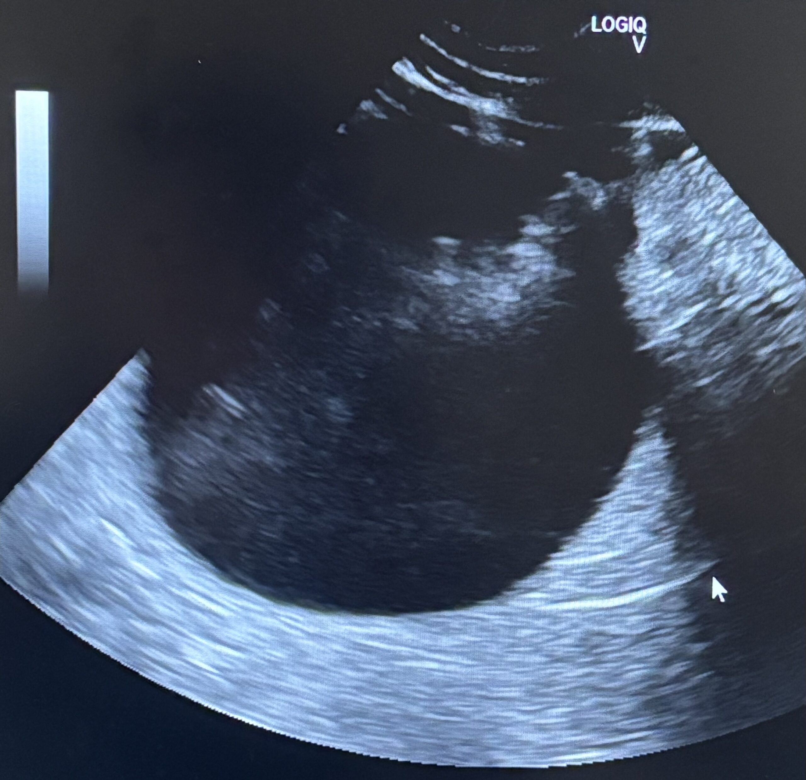 術前の超音波検査において、膀胱は極限まで拡張し、膀胱壁は今にも破裂しそうなほど薄くなっている危険な状態でした。直ちに緊急処置として膀胱穿刺を行い、ほぼ血液成分のみの尿を80ml抜去しました。この穿刺自体、膀胱破裂を招きかねない極めて緊迫した局面でしたが、これにより一時的な減圧に成功しました。しかし、尿道先端部での物理的な閉塞によりカテーテルの通過は不可能であり、内科的解除が困難であることから、直ちに外科的介入によって尿路を確保する適応と判断しました。