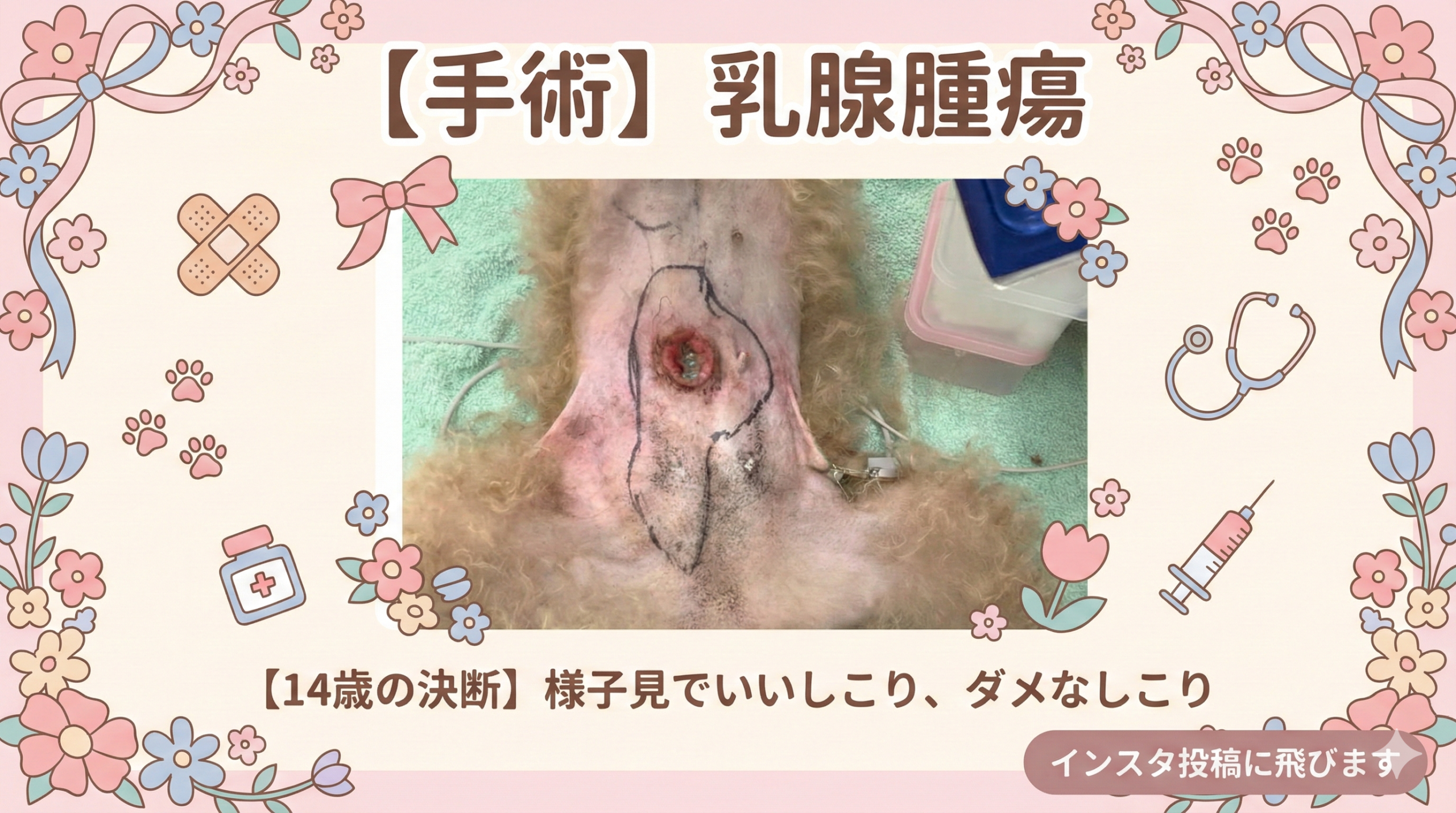 14歳という高齢での手術には、当然リスクが伴います。しかし、このまま自壊した腫瘍を放置すれば、痛みと感染に苦しみ続けることになります。