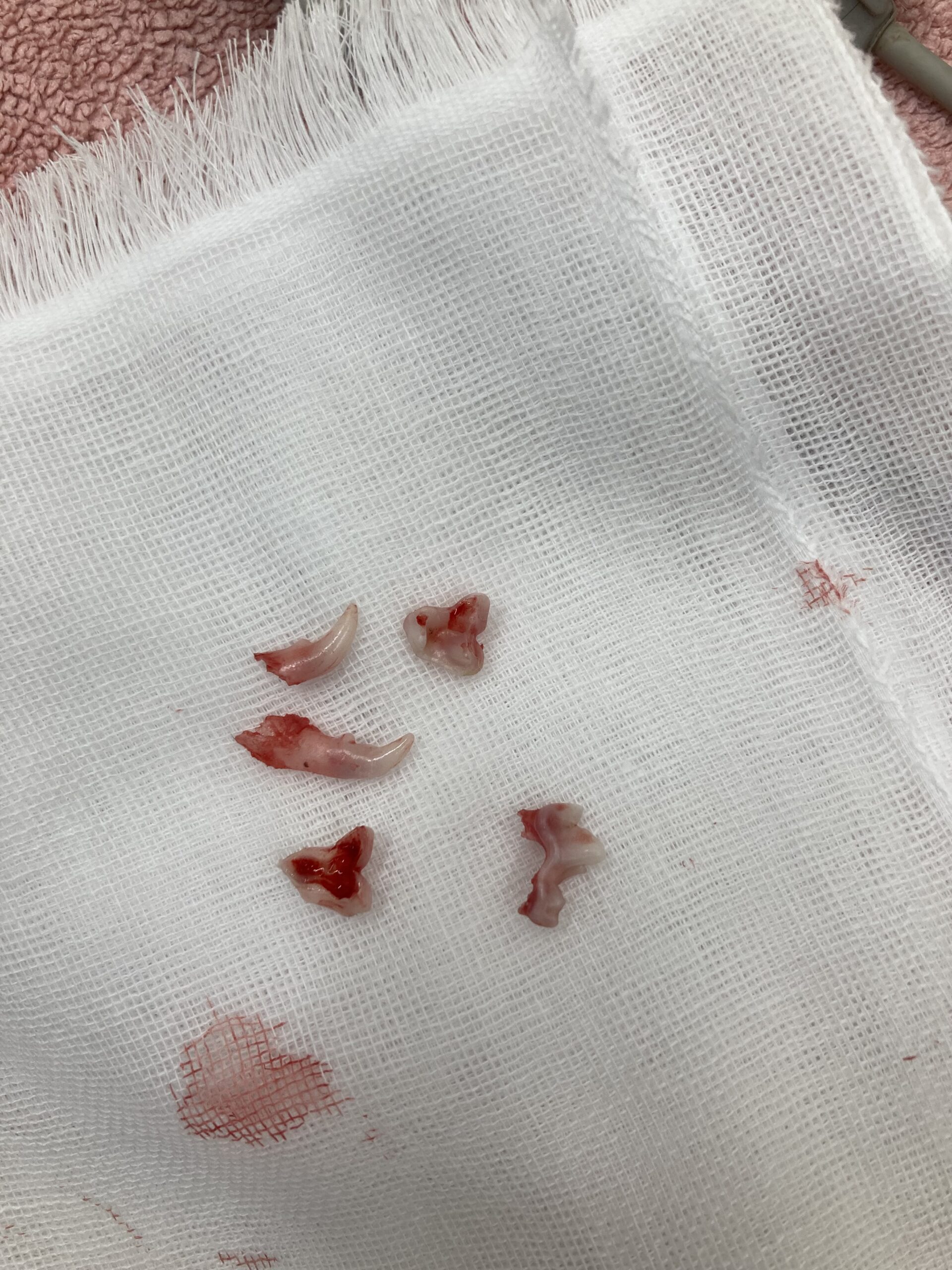 若い子は回復が早いことが多く、術後の痛みも強く出ない場合があります。ただし個体差があるため、必要に応じて鎮痛薬を使用します。食事は状態により当日から可能なこともありますが、抜歯の本数や歯肉の状態によって調整します。