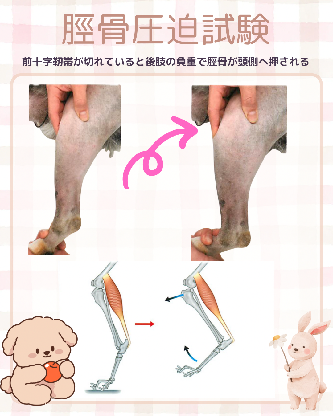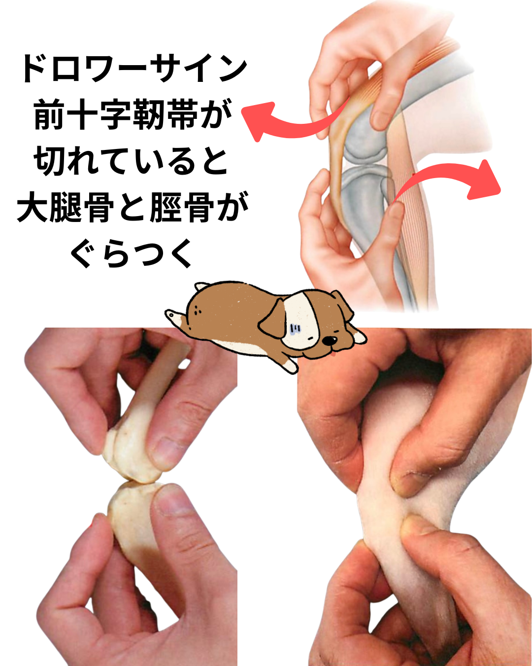 脛骨が前へ滑れば陽性。部分断裂では30°屈曲で陽性/伸展で陰性など“段差”。若齢のpuppy drawerは関節包弛緩で動くことがある。