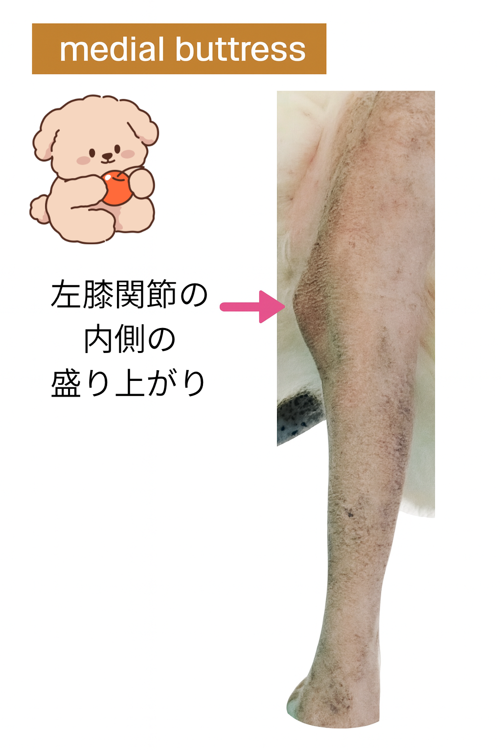 - 熱感・関節水腫、痛み(滑膜炎)、内側のゴツゴツ=medial buttress。