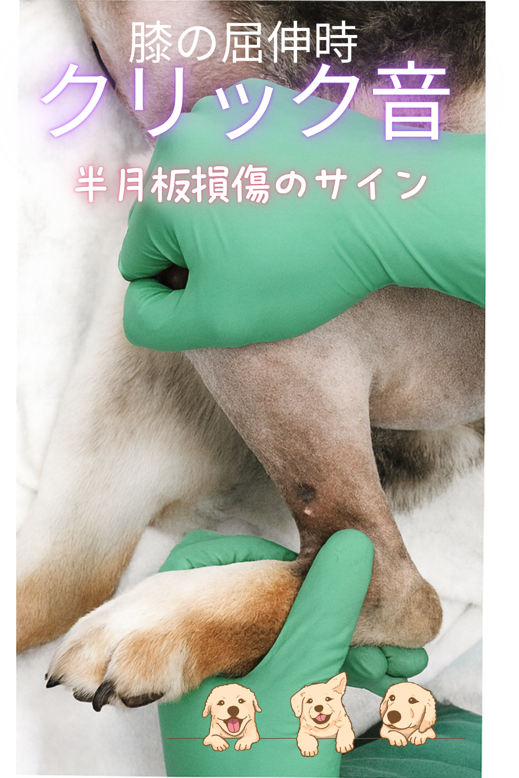 - 可動域:伸展で161°前後、屈曲で約41°(犬種差あり)。疼痛や機械的ブロックがあれば半月板を疑う。