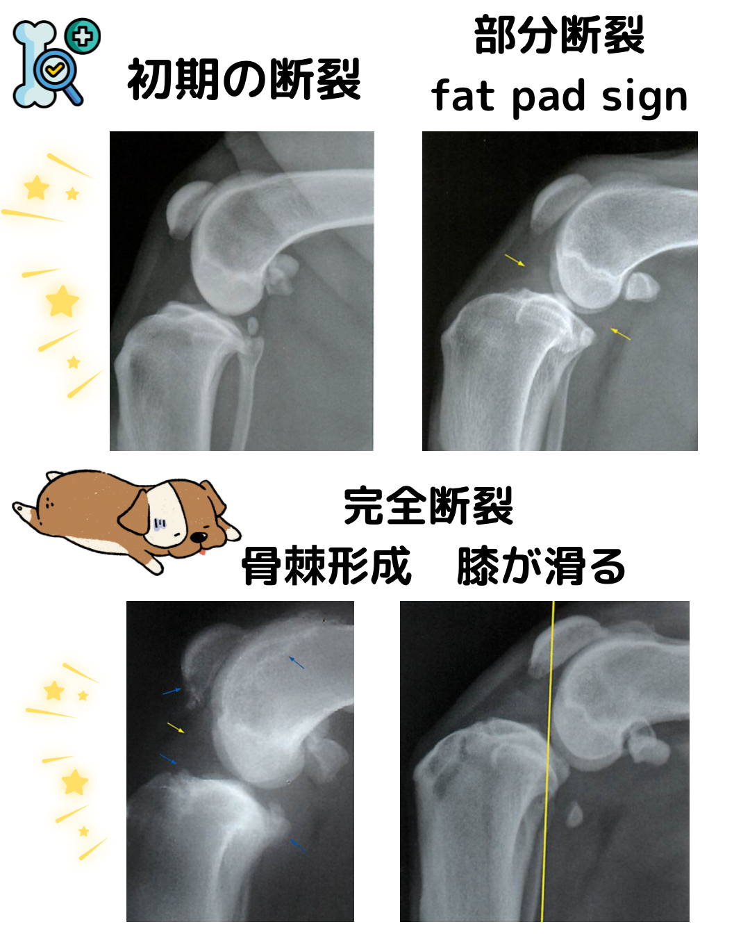 - レントゲン(X線):早期はfat pad signと関節水腫、進行で骨棘や脛骨粗面の変化。腫瘍の鑑別(骨肉腫・滑膜肉腫・骨髄炎ほか)の赤旗も必ずチェック。