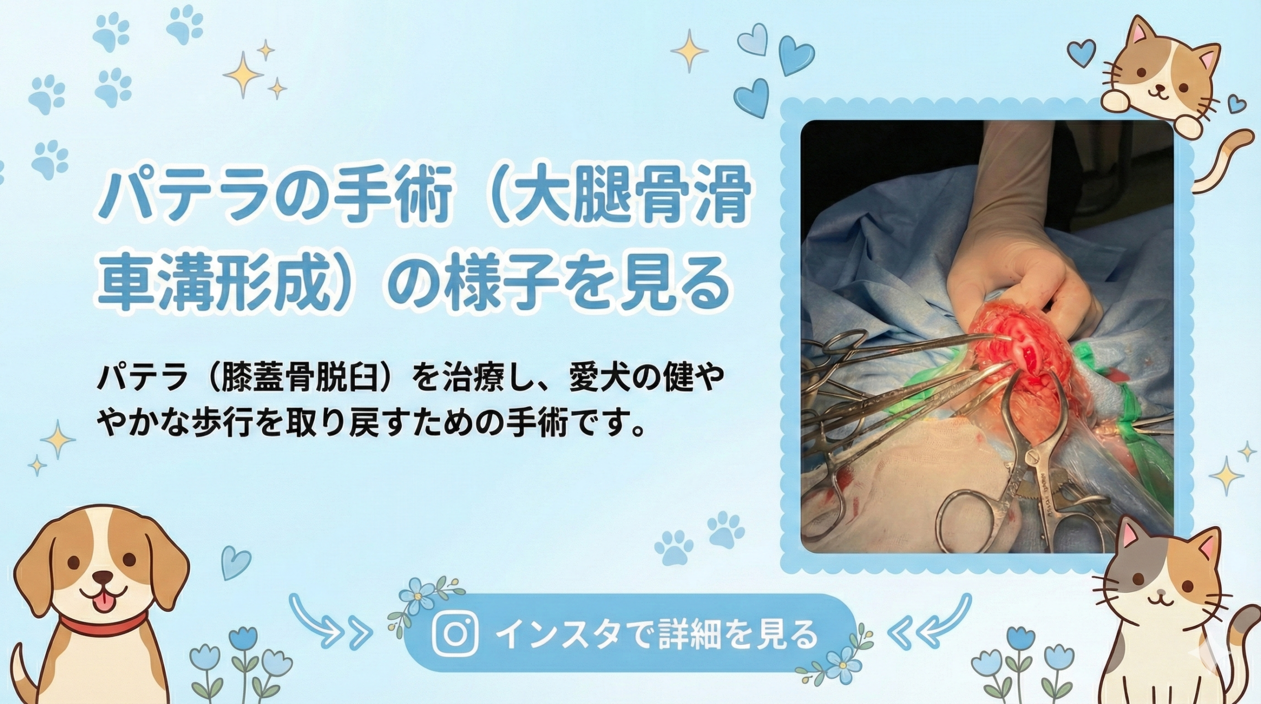 早期の手術は成功率も高いため、びっこを引き始めるなどの症状が見られたら、早めの治療介入をご案内しています。