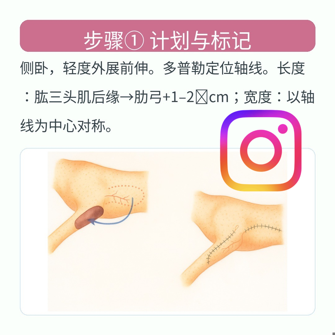 - 轴线:可触及的肱三头肌后缘之后的线,作为皮瓣中心线。