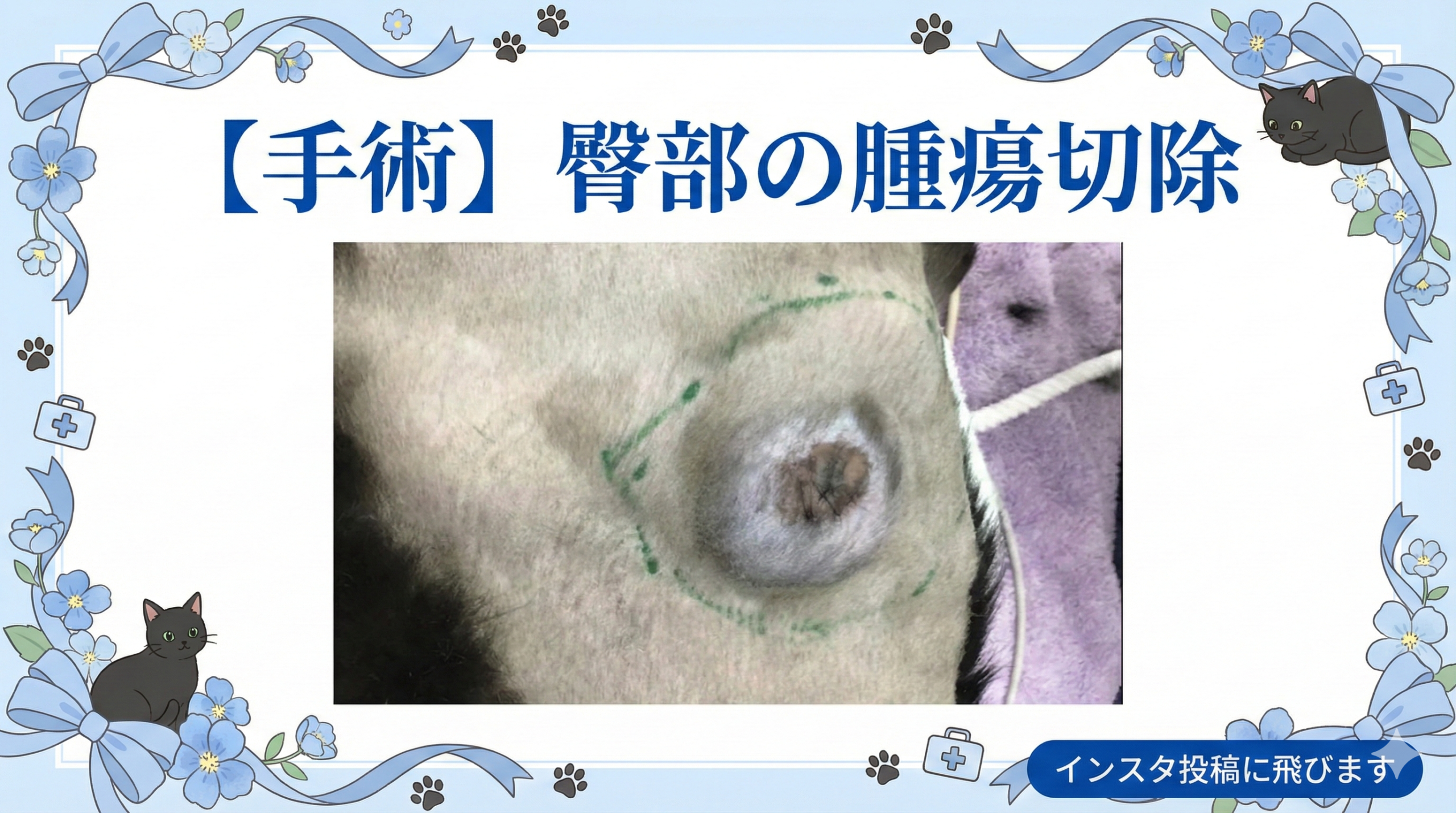 悪性腫瘍の可能性も考慮し、再発を防ぐために周囲の組織を含めた広範囲の切除を行いました(マージン確保)。麻酔管理に細心の注意を払い、手術は無事に成功しました。